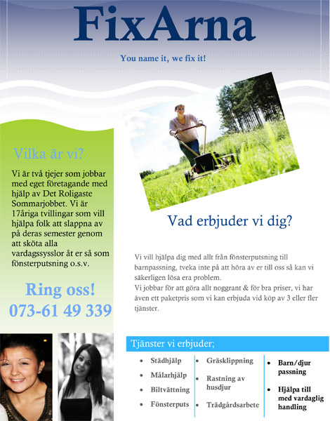 Vi är 2 tjejer som har startat ett eget litet företag FixArna, med hjälp av kommunen, så vi har valt att hjälpa folk att verkligen ta ledigt under sin semester!