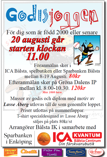 Anmälan (kontant betalning): Startkuvert finns att köpa 8-19 augusti på Sparbanken och Spelbutiken ICA Kvantum i Bålsta. Avgiften är 80 kronor.
